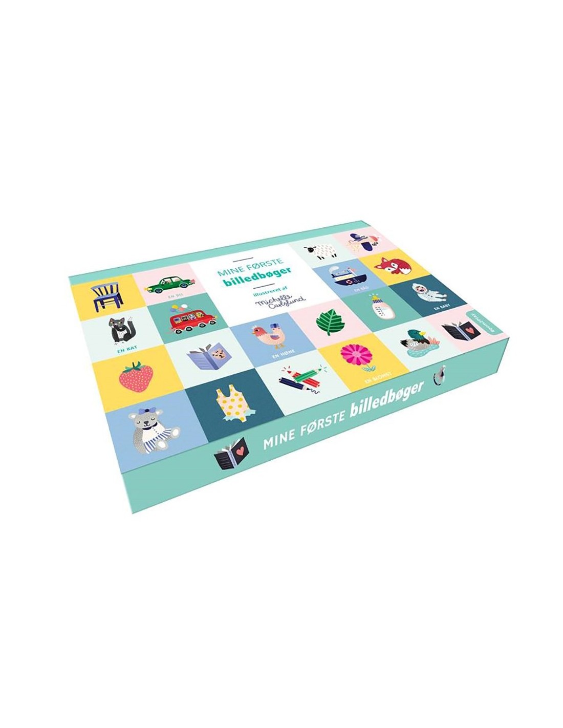 Deluxe bogæske i med magnetluk, udformet som en bog der åbnes og afslører 6 små billedbøger i kraftig kvalitetskarton med en beskrivende tekst og fine tegninger af barnets første ord og ting.