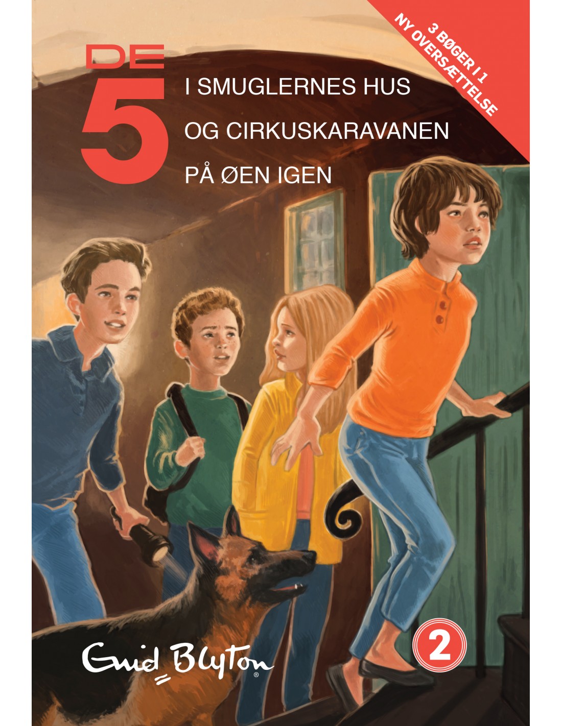 Et samlebind med tre spændende historier om De 5, der består af Julian, Dick, Anne, Georg og hunden Tim. Sammen kommer børnene ud for mange eventyr og gådefulde mysterier. Ligegyldigt hvor de befinder sig, oplever de noget spændende! DE 5 I SMUGLERNES HUS Et stormvejr ødelægger Kirrinhyttens tag, og De 5 må holde deres ferie hos en af Georgs fars kolleger. Børnene bliver gode venner med husets to børn, Sorte og Marybelle, og sammen går de på opdagelse. Men også andre lusker omkring. Der er skumle ting på færde. DE 5 OG CIRKUSKARAVANEN De 5 får lov at tage på campingtur alene! De rejser efter et cirkus og glæder sig til at komme på eventyr. Da de slår sig ned i nærheden af cirkusset, bliver de venner med drengen Ned og hans chimpanse Pongo. Men to af artisterne kan ikke lide børnene og prøver med al magt at få dem til at rejse. Det er meget mystisk, og De 5 tager selvfølgelig kampen op. DE 5 PÅ ØEN IGEN Georgs far arbejder på nogle tophemmelige forsøg, og han flytter sine eksperimenter til Kirrinøen for at have dem i fred. Han tager Tim med sig som vagthund. Da Tim en aften forsvinder, bliver Georg sikker på, at der er noget helt galt. Kan De 5 løse gåden og forhindre, at onkel Quentins resultater bliver stjålet?