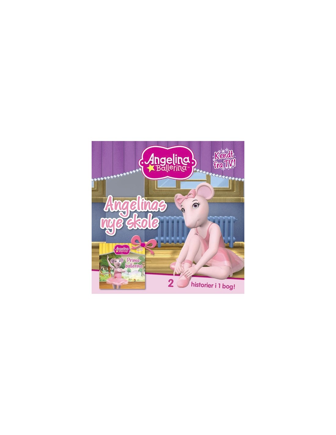 Her får du hele to historier om Angelina Ballerina: 1)Angelinas Nye Skole, Angelina er meget spændt på at møde sine kammerater. 2) Primaballerina. Angelina vil være lige så dygtig som de ældre ballerinaer. Læs den spændende beretning om det lykkes hende.