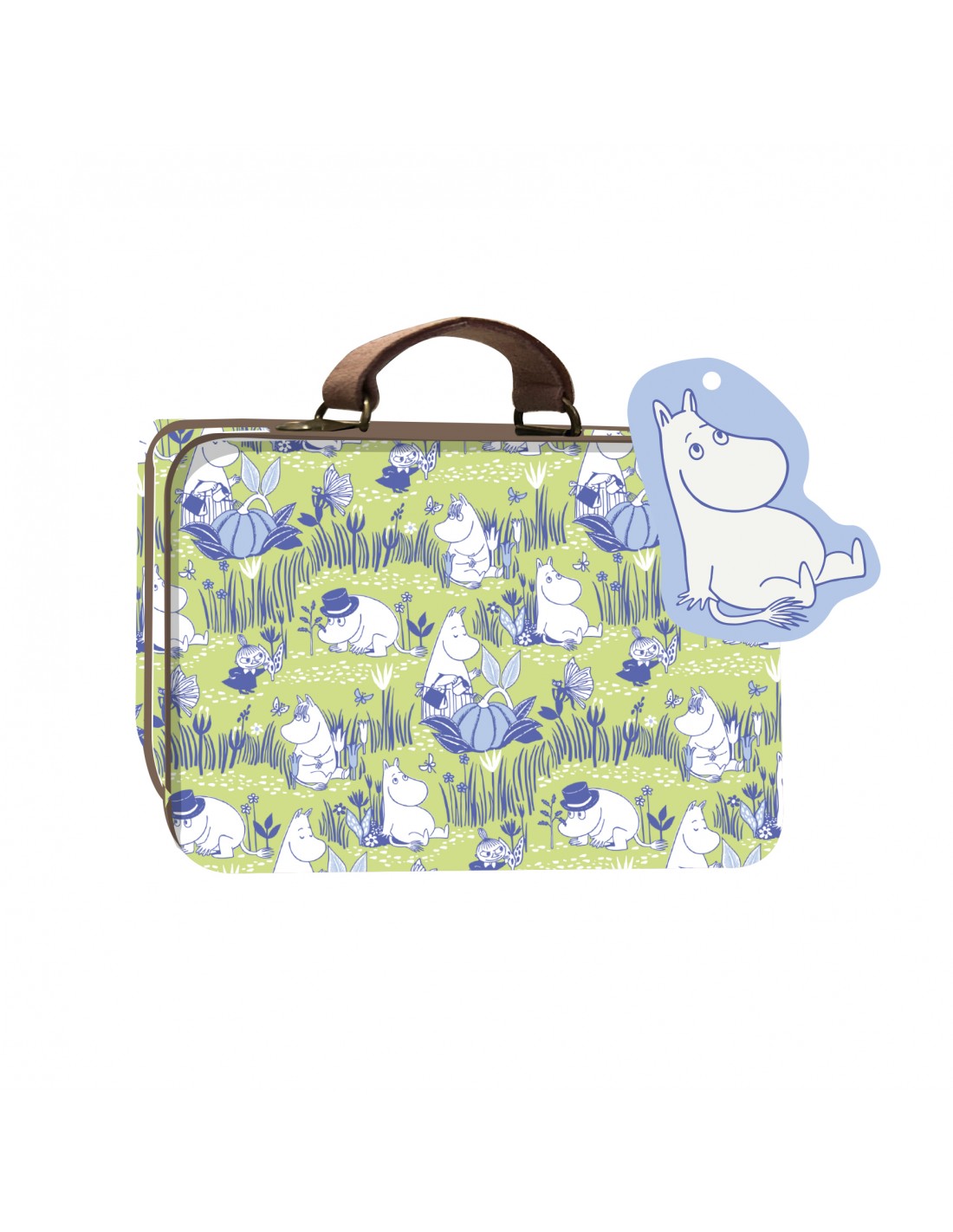 Træd ind i Mumiernes fredelige og fantasifulde verden med denne lille grønne blik-kuffert, dekoreret med en charmerende gennemgående illustration inspireret af Tove Janssons elskede fortællinger. Omgivet af natur, venskab og stille øjeblikke indfanger kufferten den rolige og eftertænksomme ånd, der gør Mumiverdenen så særlig.