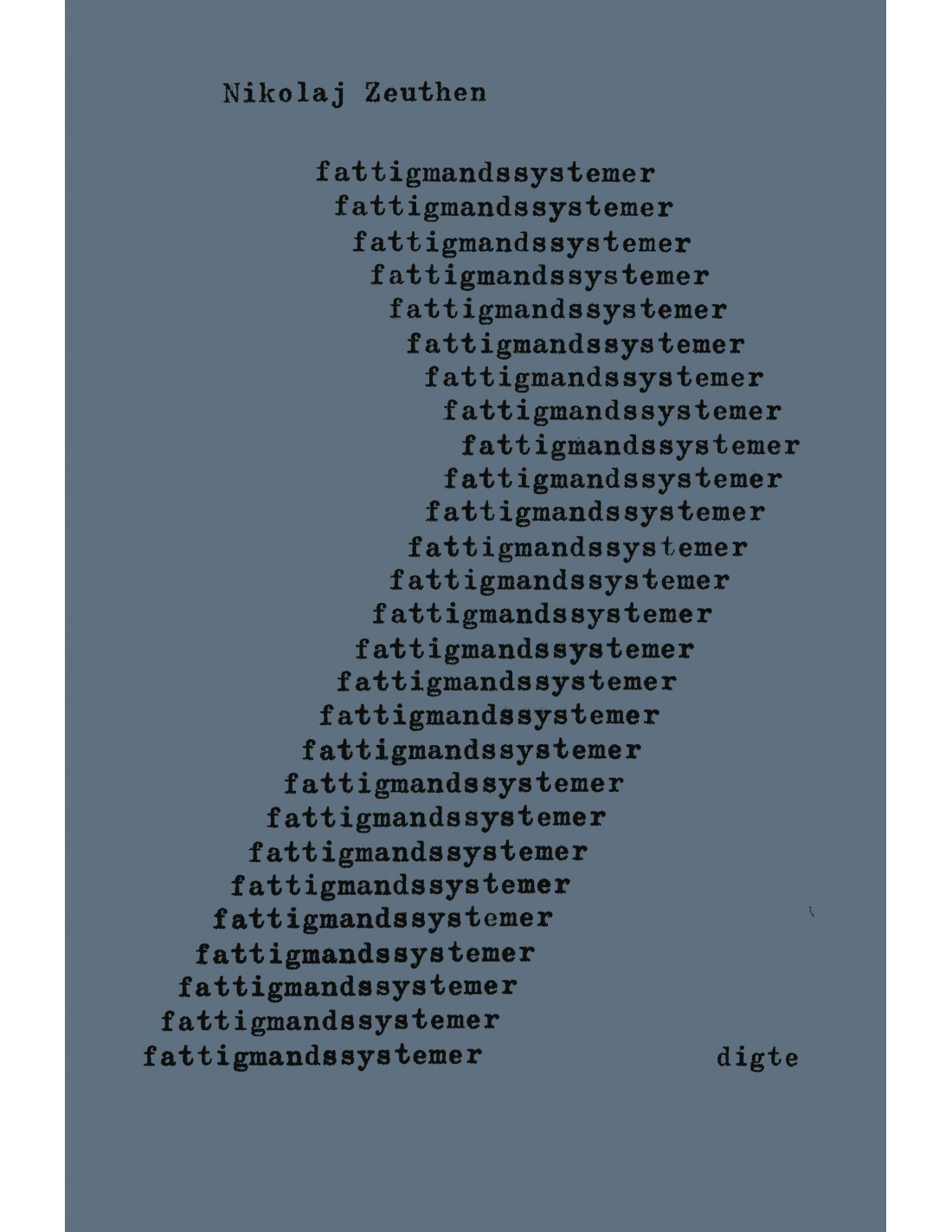 Fattigmandsystemer er Nikolaj Zeuthens sjette digtsamling, et totalskriftværk, der bestræber sig på at stille sig til rådighed for skriften. "Man må begynde på en fejltagelse," hedder det, men så er sproget også sat i bevægelse. Graden af indfaldstolerance er høj, og skrivemaskinen kører med hverdagsreportage, vilde poetiske slag i luften og modvillig berøring af aktuelle emner. Igennem de ofte meget udkoksede, sammenbrændte og læserafprøvende tekster løber en ganske jordnær diskussion af digterens rolle og status i samfundet. Kan man gå linen ud yndefuldt? Er det for surt altid at være på røven og ikke have råd til en bil og restaurant som de andre? Eller er man bare privilegieblind og et klynkehoved? Viljen til poetisk skrift som udfoldes i bogen er det implicitte modsvar på den forvirring og resignation som teksterne ofte udsiger på overfladen.