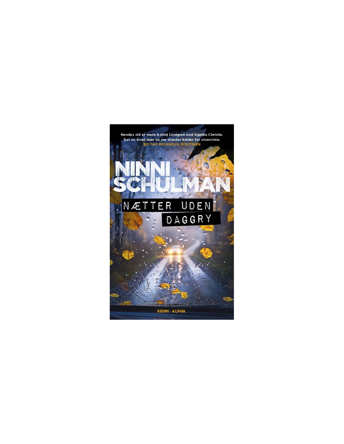 NÆTTER UDEN DAGGRY er tredje del i Ninni Schulmans roste og populære serie om eks-politikvinden Ingrid Wolt og hendes enmandsdetektivbureau.