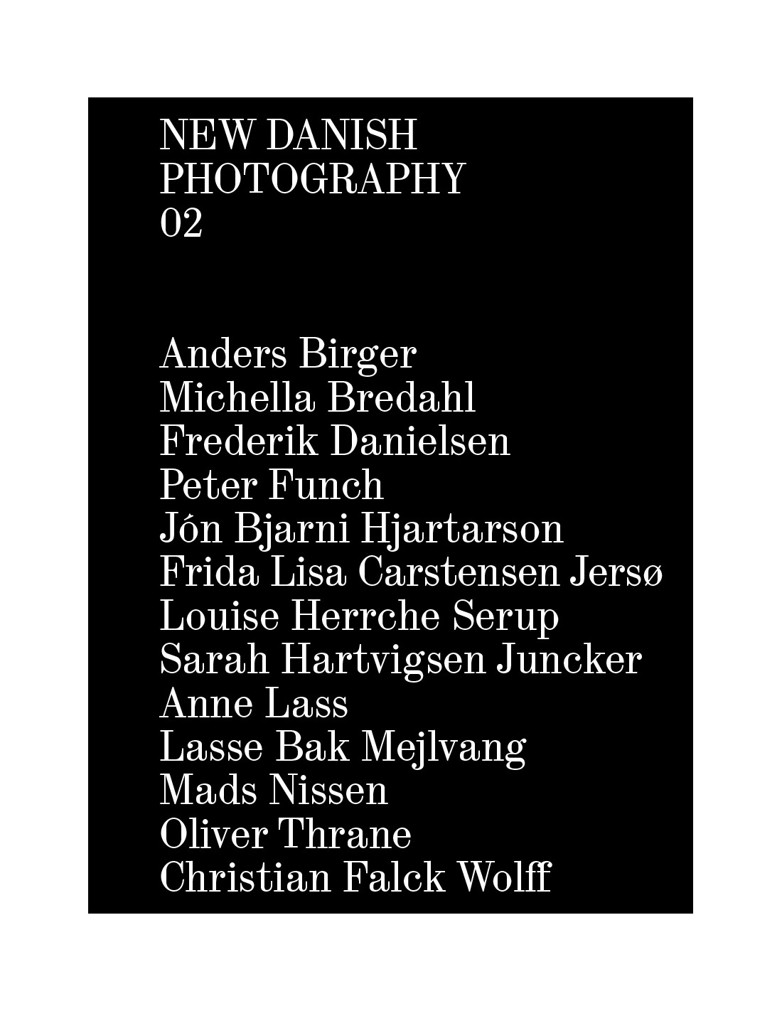 New Danish Photography 02 indeholder serier af fotograferne: Anders Birger, Michella Bredahl, Frederik Danielsen, Peter Funch, Jón Bjarni Hjartarson, Frida Lisa Carstensen Jersø, Louise Herrche Serup og Sarah Hartvigsen Juncker, Anne Lass, Lasse Bak Mejlvang, Mads Nissen, Oliver Thrane og Christian Falck Wolff.