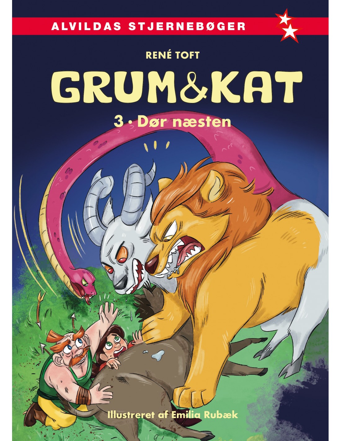 Et bæst med tre hoveder truer en landsby. Grum og Kat vil hjælpe. Men en falsk helt er på spil. Og han har en styg plan.