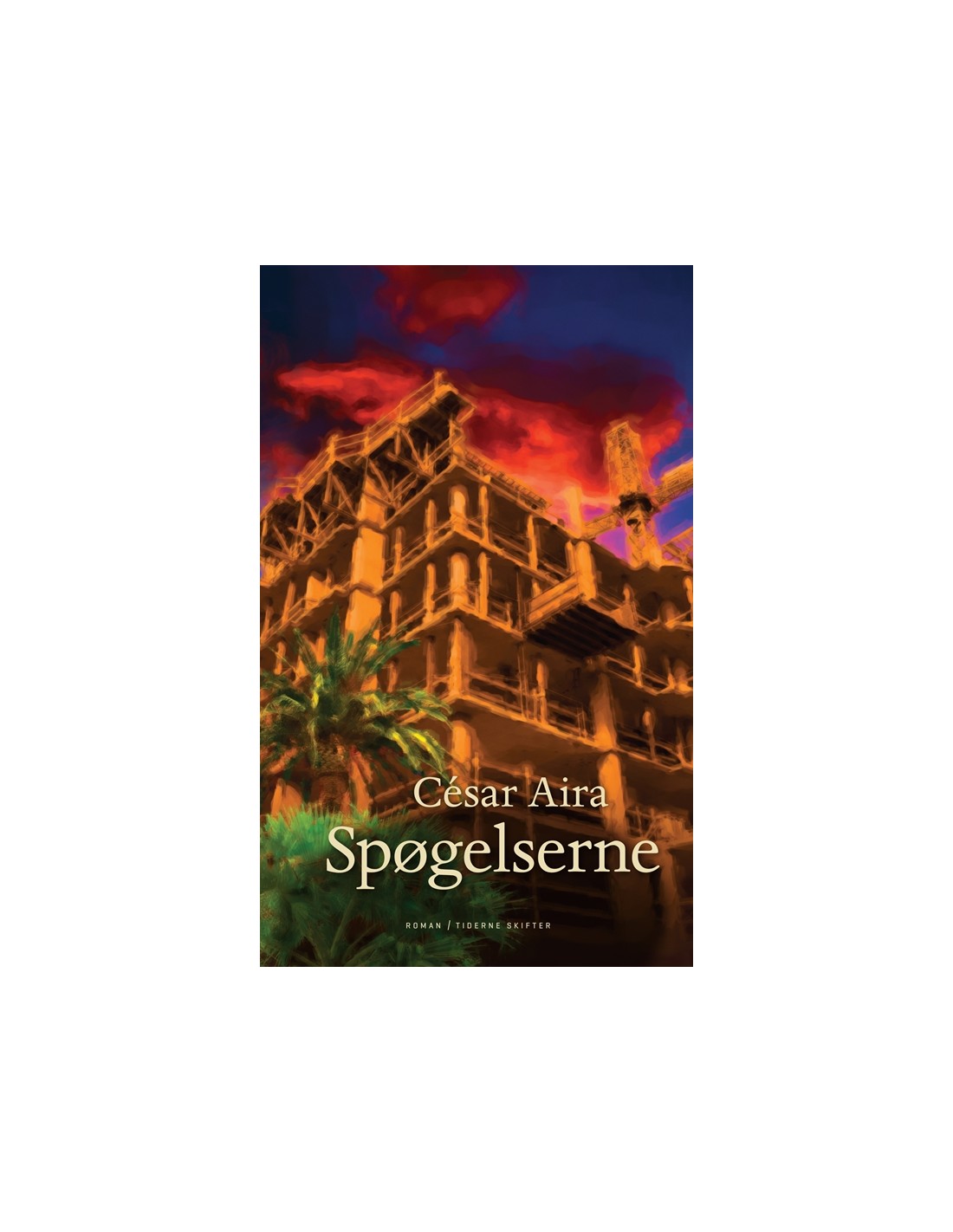 En af nutidens vigtigste sydamerikanske forfattere præsenteres nu på dansk. César Aira (født 1949) er argentiner og bor i Buenos Aires. I den spansktalende verden er han et ikon men hans forfatterskab nyder stor anerkendelse over alt i verden:New York Times: César Aira er latinamerikansk litteraturs Duchamp & en af de mest provokerende og idiosynkratiske romanforfattere i den spansktalende verden som man ikke bør gå glip af. Los Angeles Times: Sikken en gave: at kunne se frem til en ny Aira-roman hvert år i resten af ens liv. El País: Man er nødt til at tage til Argentina for at finde vor tids mest originale chokerende interessante og revolutionerende spansktalende forfatter: César Aira. Spøgelserne foregår i løbet af én dag. Den 31. december. Stedet: et boligkompleks med luksuslejligheder under opførelse i centrum af Buenos Aires. Her har en chilensk immigrantfamilie midlertidigt fået tag over hovedet. Til at begynde med ligner romanen hard core realisme støbt i beton og ikke en linedans i stor højde en skarp og svimlende fantasi som den er. Det ufærdige byggeri hjemsøges nemlig af spøgelser i skikkelse af nøgne mandspersoner dækket af cementstøv og med prangende kønsorganer. Især er familiens teenagedatter og hendes mor optaget af dem hvem de er og hvad de vil. Indtil det skræmmende kritiske punkt i historien hvor det går op for moren at hendes datters liv er i fare.