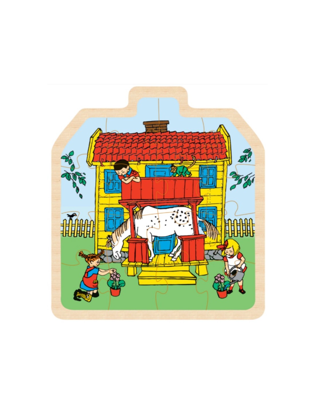 Dette charmerende trærammepuslespil er formet som huset fra Pippi Langstrømpes verden. Når børnene placerer hver brik i trærammen, samles Villa Villekulla langsomt og afslører sit farverige og legende ydre.
