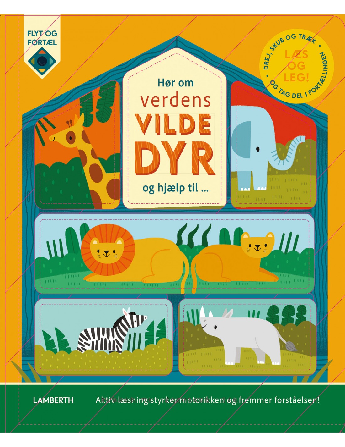 Meget enkle, farverige billeder af genkendelige eksotiske dyr med en kort tekst, som lægger op til aktiv læsning.
