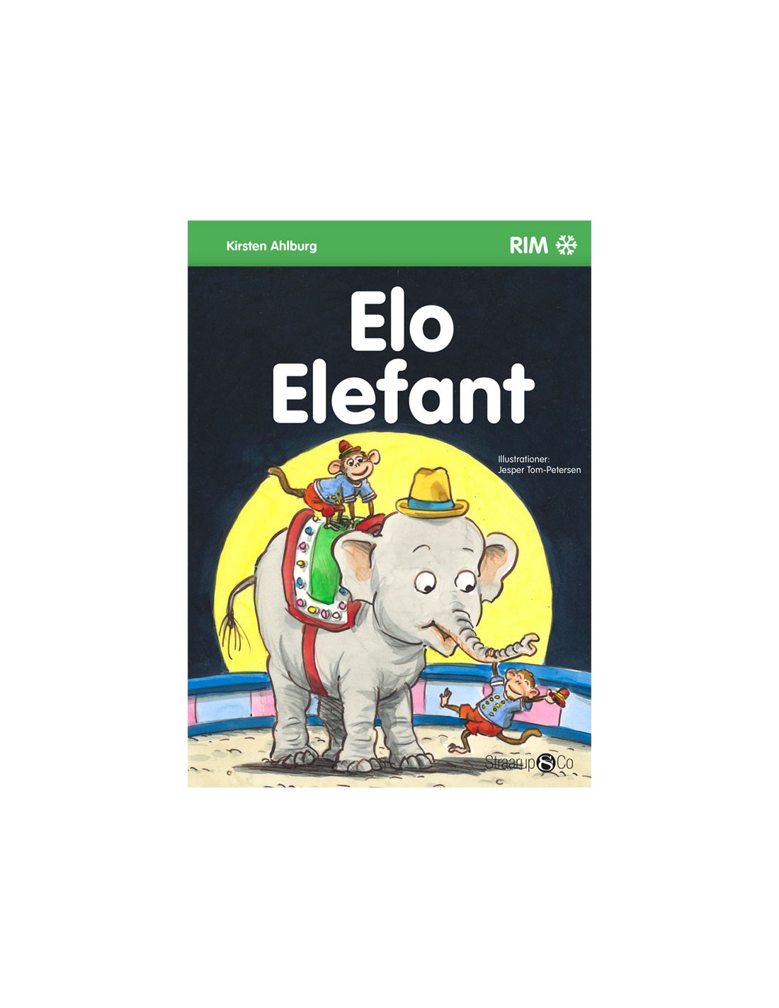 Her er Elo Elefant.Se, hvor han er elegant.Elos hat er gul og blå.Sadlen er med perler på.