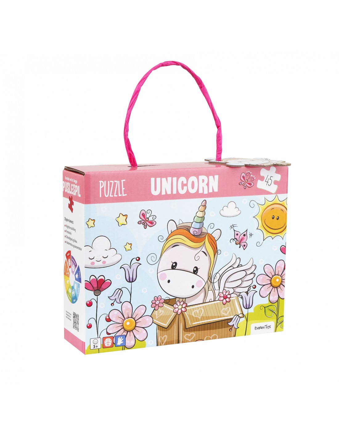 På bagsiden af æsken findes en enkel aktivitet med spørgsmålet: »Kan du finde disse ting i puslespillet?« Det giver en ekstra dimension til legen og opmuntrer barnet til at kigge nærmere og udforske illustrationen endnu mere. Puslespillet leveres i en solid æske med snorehåndtag, som gør det nemt at opbevare, bære og tage med, hvor eventyret fortsætter.