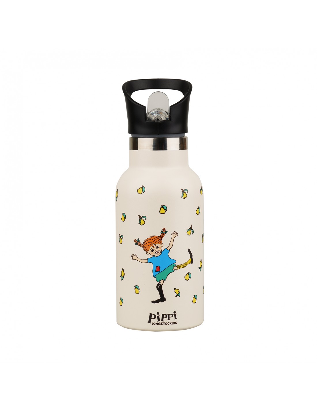 Denne Pippi drikkeflaske i en fin cremefarve, dekoreret med Pippi illustrationer, kombinerer hverdagsfunktionalitet med tidløst design. Fremstillet i slidstærkt rustfrit stål er flasken let, robust og skabt til daglig brug - hvad enten det er i skole, på arbejde, på udflugter eller til udendørs eventyr.
