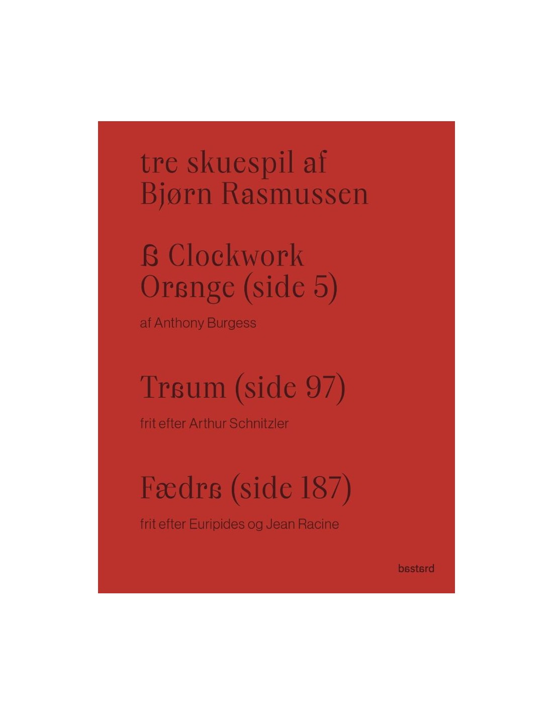 Forfatter Bjørn Rasmussen har et anerkendt forfatterskab bag sig, bestående af romaner og digte, men begyndte som dramatiker og har gennem årene skrevet flere sceniske tekster til roste teaterforestillinger. Med udgivelsen af tre af disse ønsker Forlaget bastard at introducere læsere for Rasmussens dramatik. Rasmussens dramatik udforsker, som resten af forfatterskabet, relationer mellem sprog, køn, seksualitet, lyst, vold og magt: med fri genskrivning og rekontekstualisering af nogle af Vestens centrale klassikere, giver han os både mørke og sårbare teatrale fortællinger om kærlighed og krænkelse i dag.