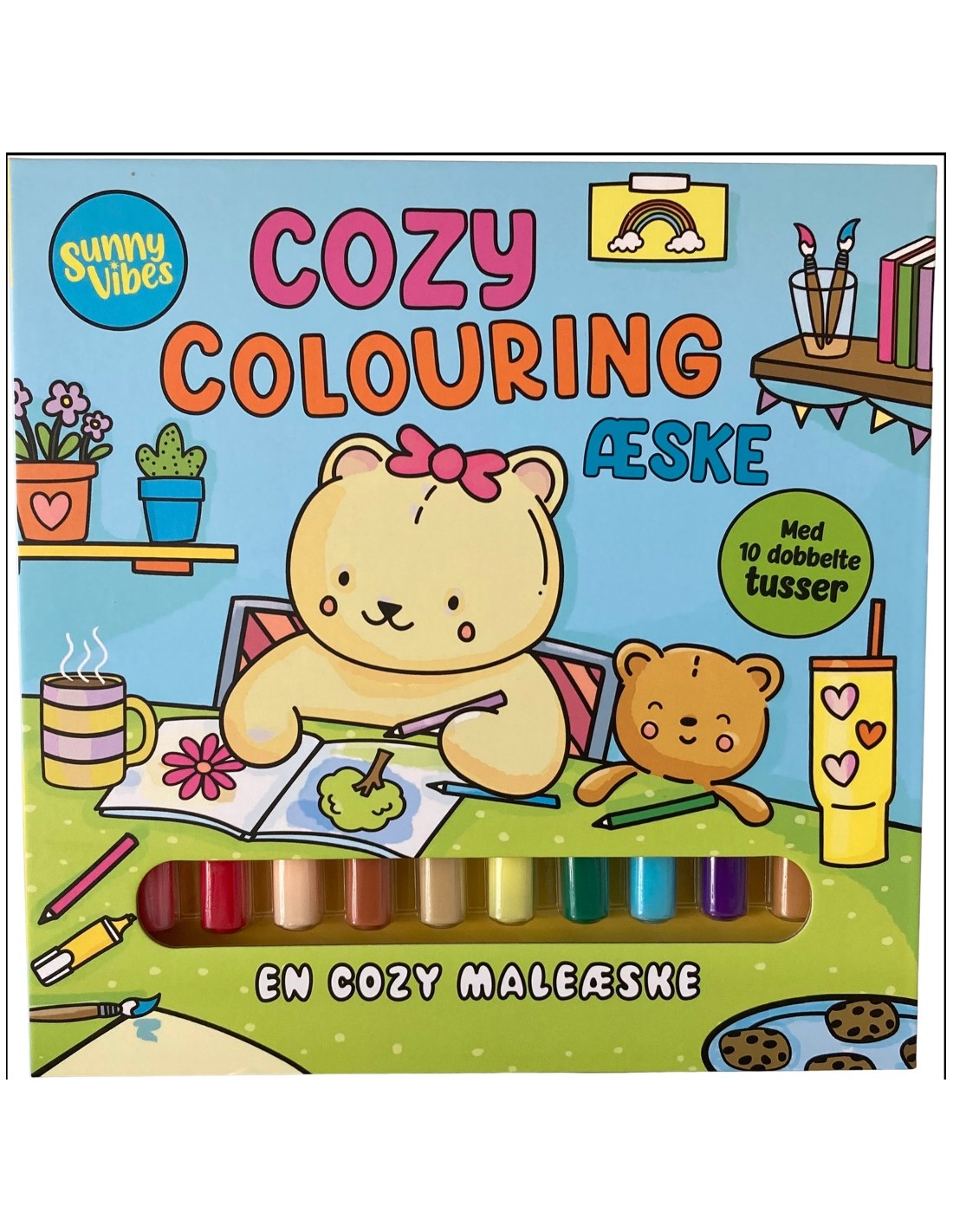 Indeholder 10 dobbelte tusser og en ekstra løs side, der kan bruges som underlag.Hvis du bliver bidt af Sunny Vibes-illustrationerne, findes der flere malebøger i serien!