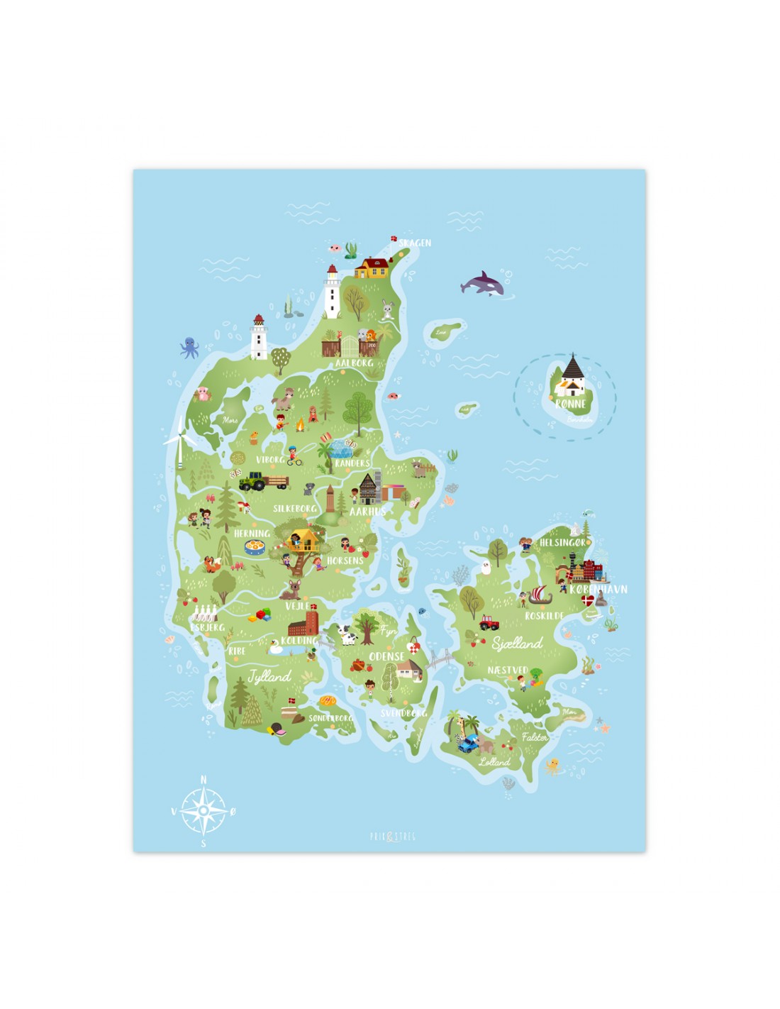 Super fint og detaljeret Danmarkskort til børn med alle de gode seværdigheder på i størrelsen 50x70cm. Passer rigtig godt sammen med alfabetplakaten og verdenskortet fra PRIK og STREG.