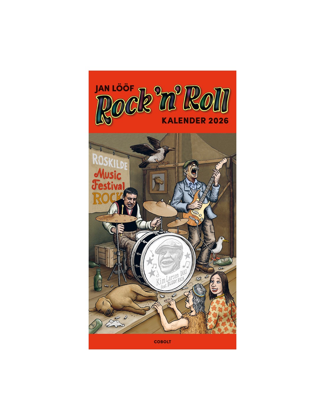 Årets mest iøjnefaldende vægkalender i ekstra stort format – en halv meter høj – med tolv mageløse portrætter af klassiske rockmusikere tegnet af den legendariske svenske illustrator, forfatter og tegneserieskaber Jan Lööf.
